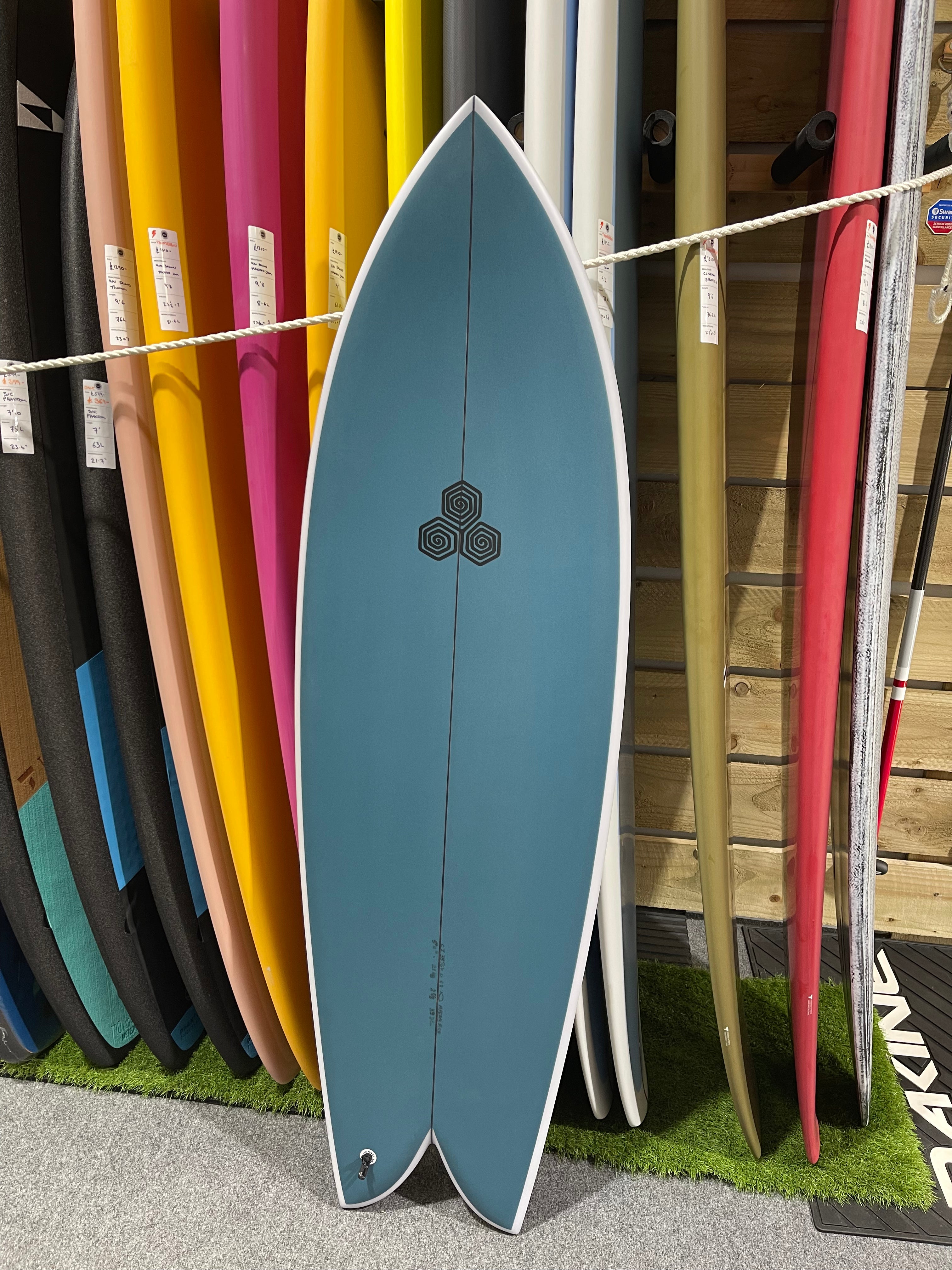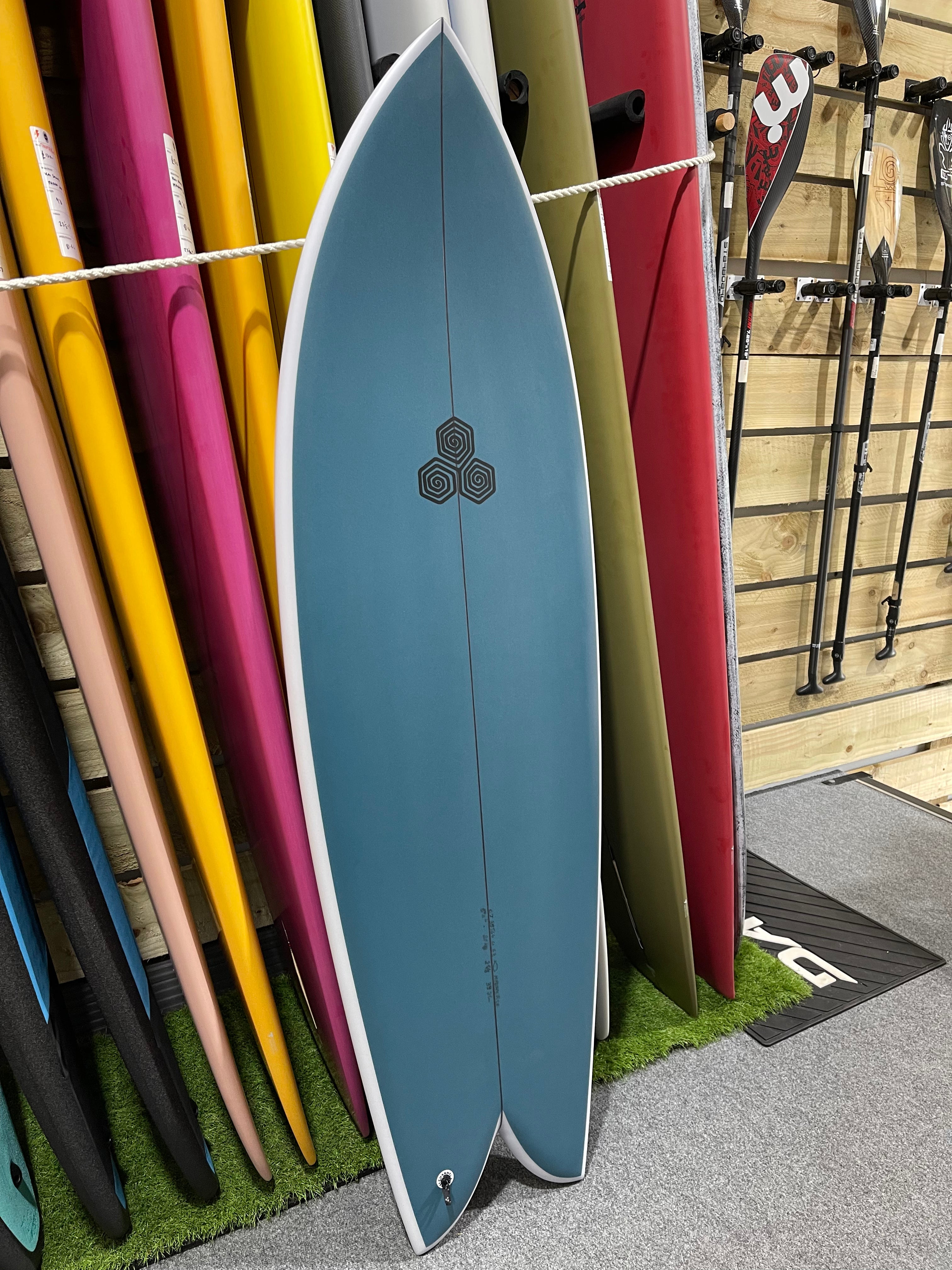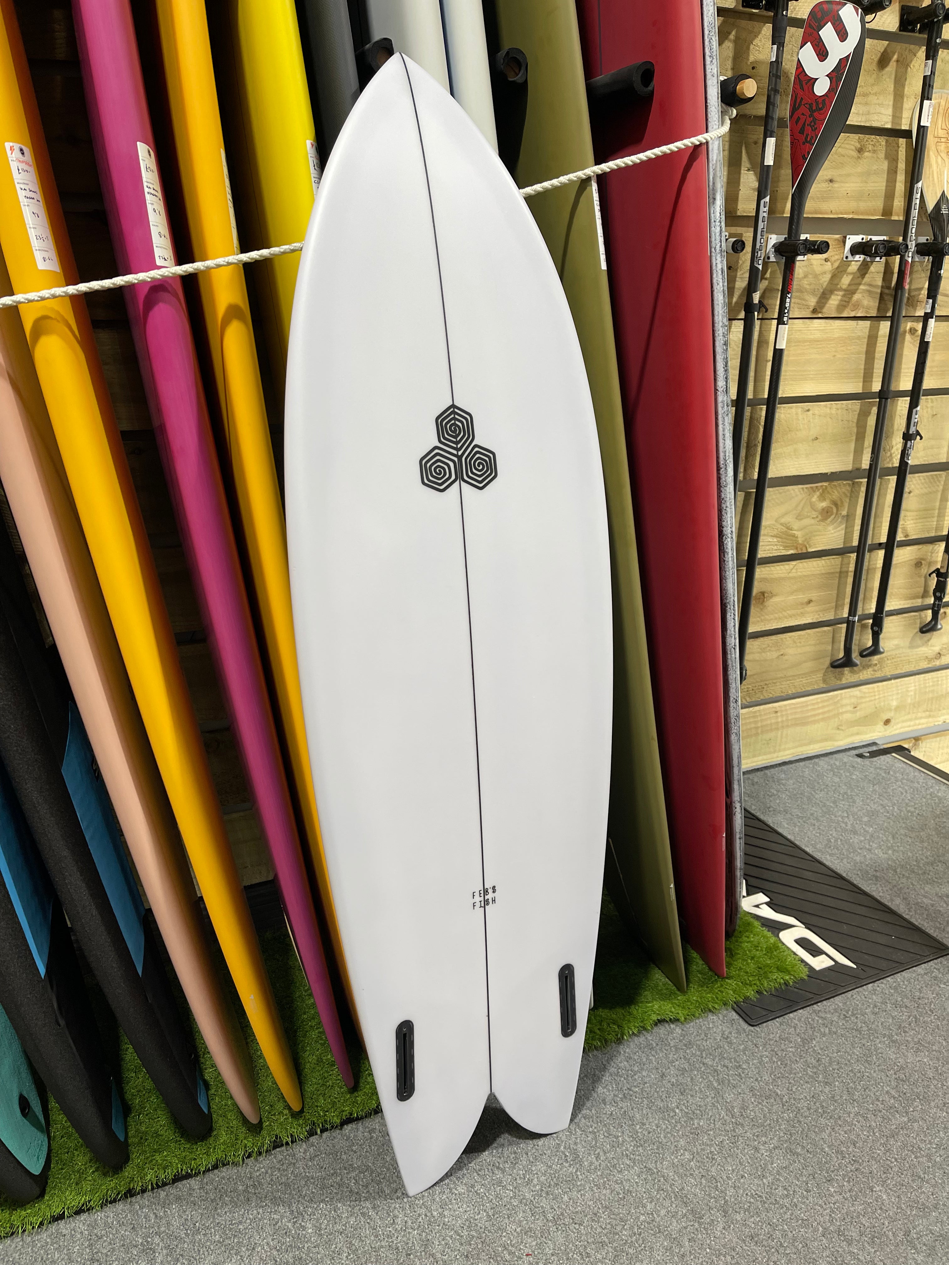 For sizing reference on the Feb's Fish, Mikey is 6'3 and 165 pounds and rides the 5'5 in stock dims.