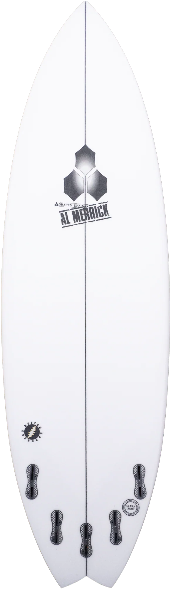The board comes stock with five fin boxes.  Designed as a quad originally Britt also created a special quad set to perfectly compliment the boards characteristics.  The fin set combines more upright front fins and raked back fins that give the board the zing and hold to go to the next level.